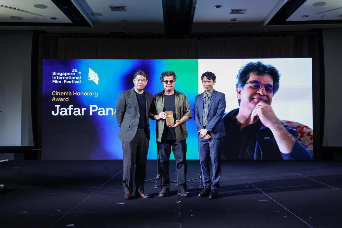Iranian film-maker Jafar Panahi (centre) receiving the Cinema Honorary Award. On his left is SGIFF programme director Thong Kay Wee and on his right is SGIFF general manager Jeremy Chua.