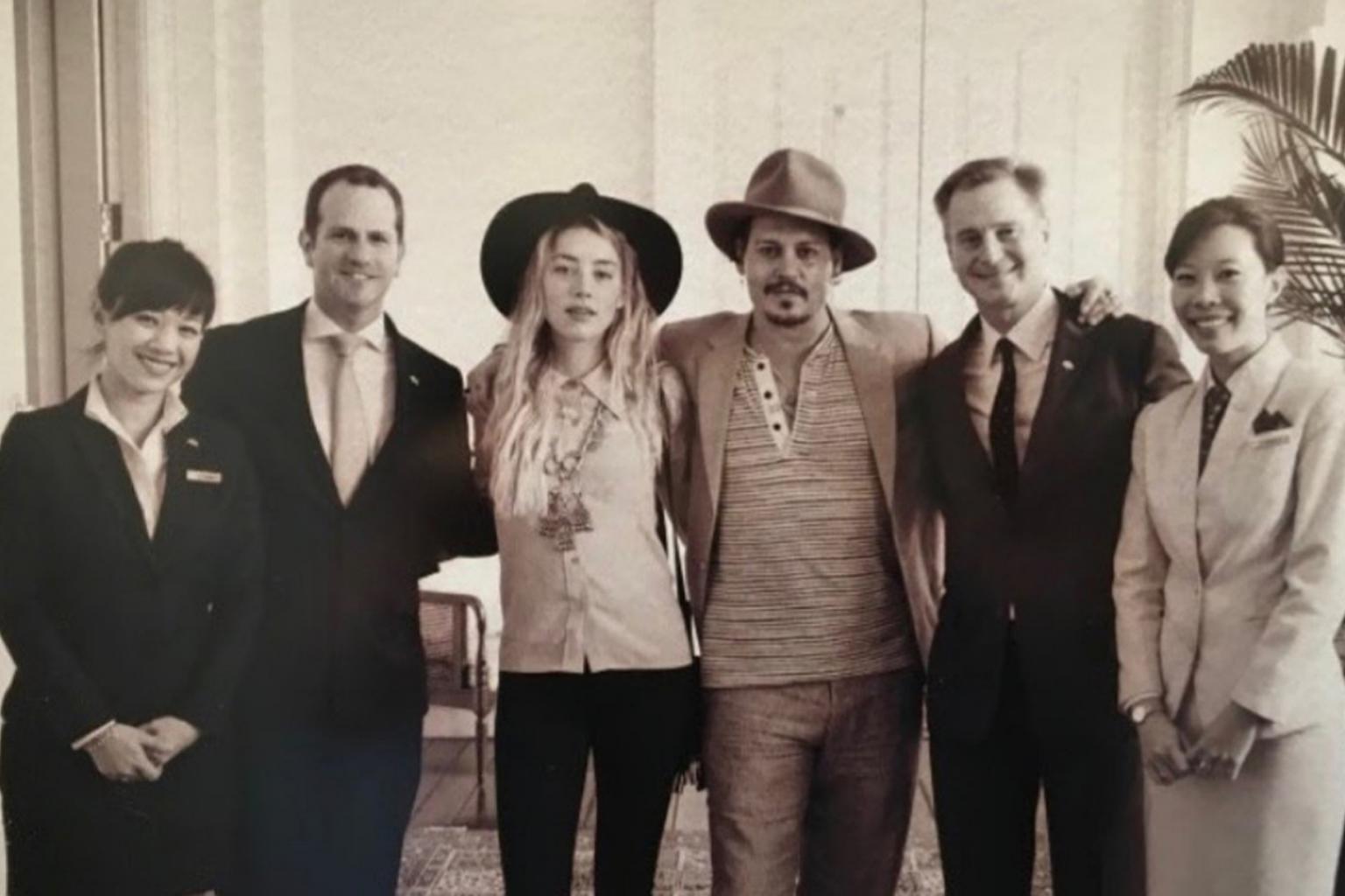 The photo showing Johnny Depp (third from right) and Amber Heard (third from left), that was reportedly taken at Raffles Hotel, was used as evidence during the couple's trial.