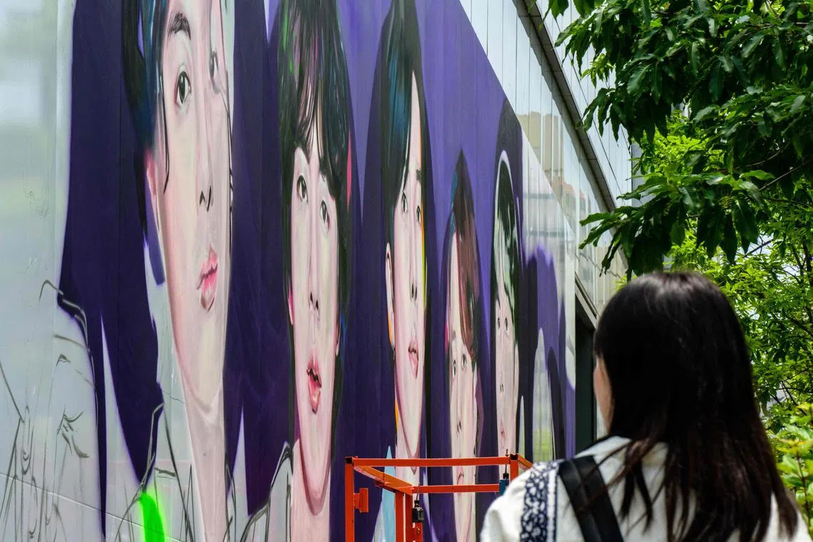 The group’s fans – known collectively as Army – gathered outside the offices of its agency Hybe to take wefies and record TikTok videos in front of a huge mural of the stars being painted on a wall.