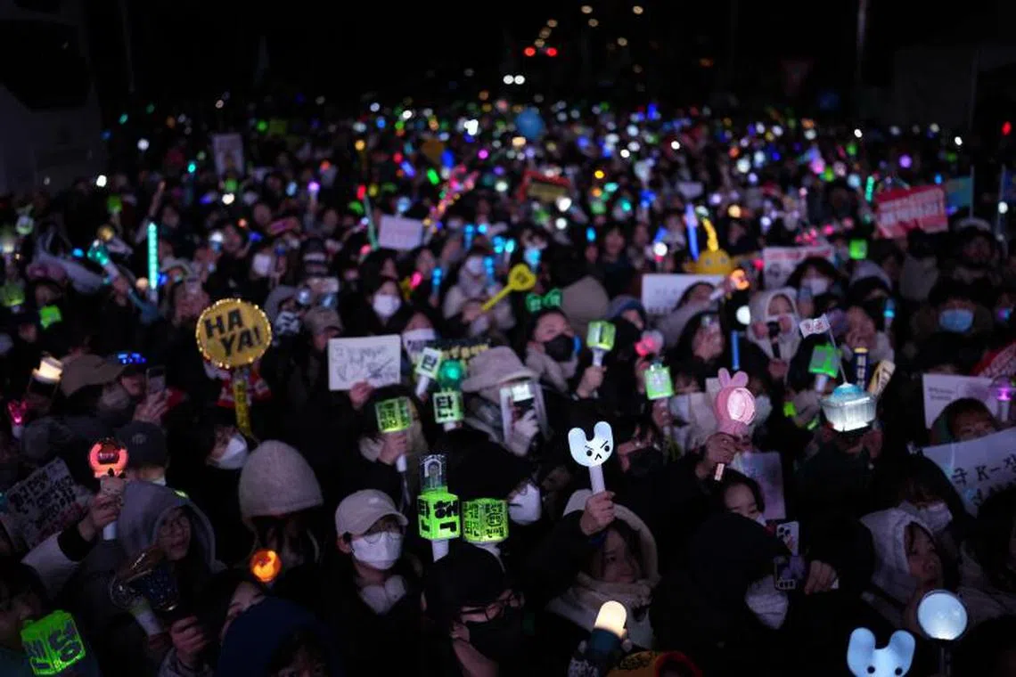 Protesters rejoicing after the impeachment motion for South Korean President Yoon Suk Yeol was passed at the National Assembly in Seoul on Dec 14.