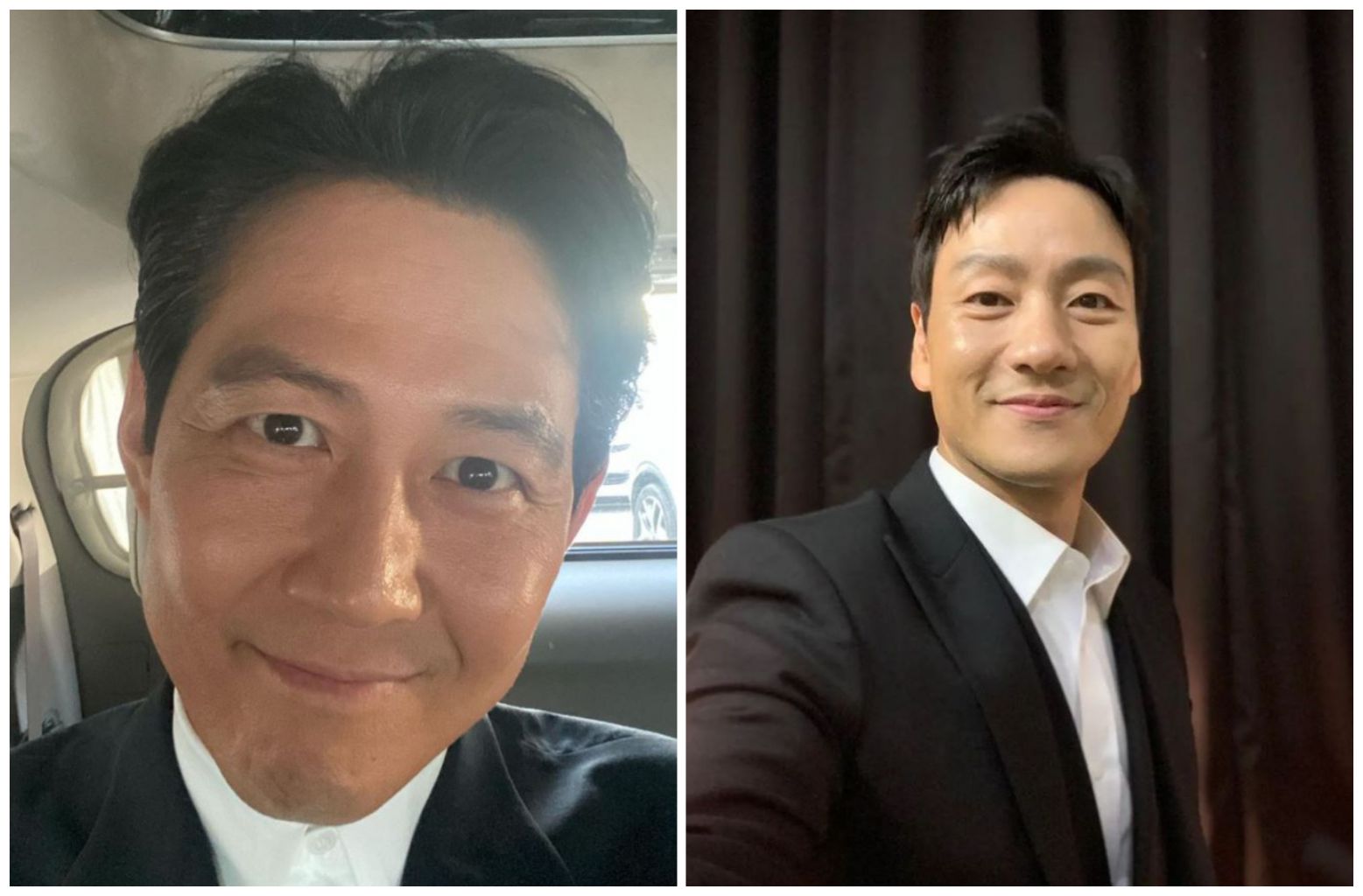 Actors Lee Jung-jae (left) and Park Hae-soo have been posting selfies with weird camera angles and awkward smiles.
