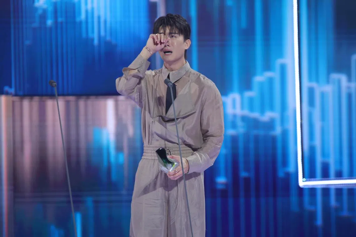 Best Supporting Actor winner Zhang Zetong cries while receiving his award onstage at the Star Awards held on April 21. He won for his performance as a villain in the series All That Glitters.