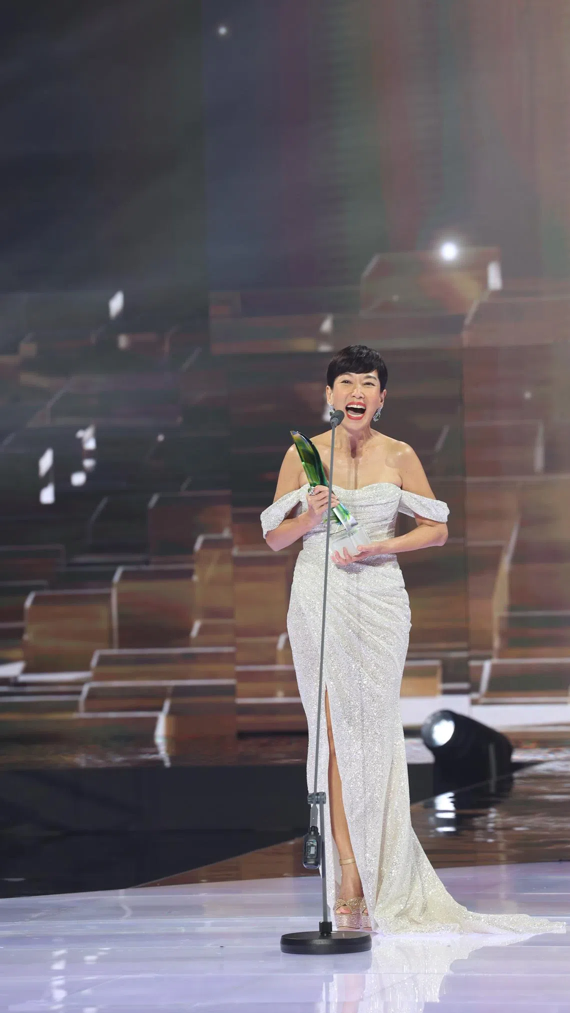 She won Best Programme Host (Entertainment and Infotainment) for Season 4 of talk-show series Hear U Out (2020 to present) and now has nine hosting wins, making her one of the most decorated artistes in Star Awards history.
