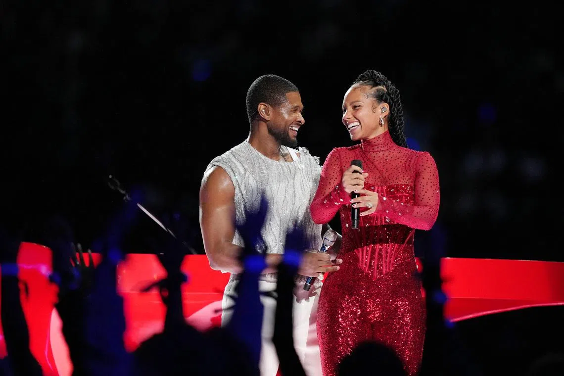 Musicians Usher (left) and Alicia Keys during the half-time show of Super Bowl LVIII at Allegiant Stadium.