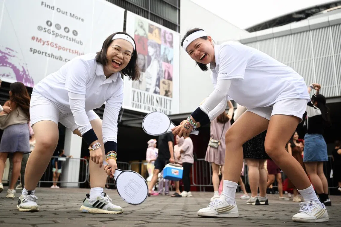 Swifties Tracy Low (left) and Leona Leong (right), both 28, dressed in tennis attire as a tribute to Taylor Swift’s The Man music video.