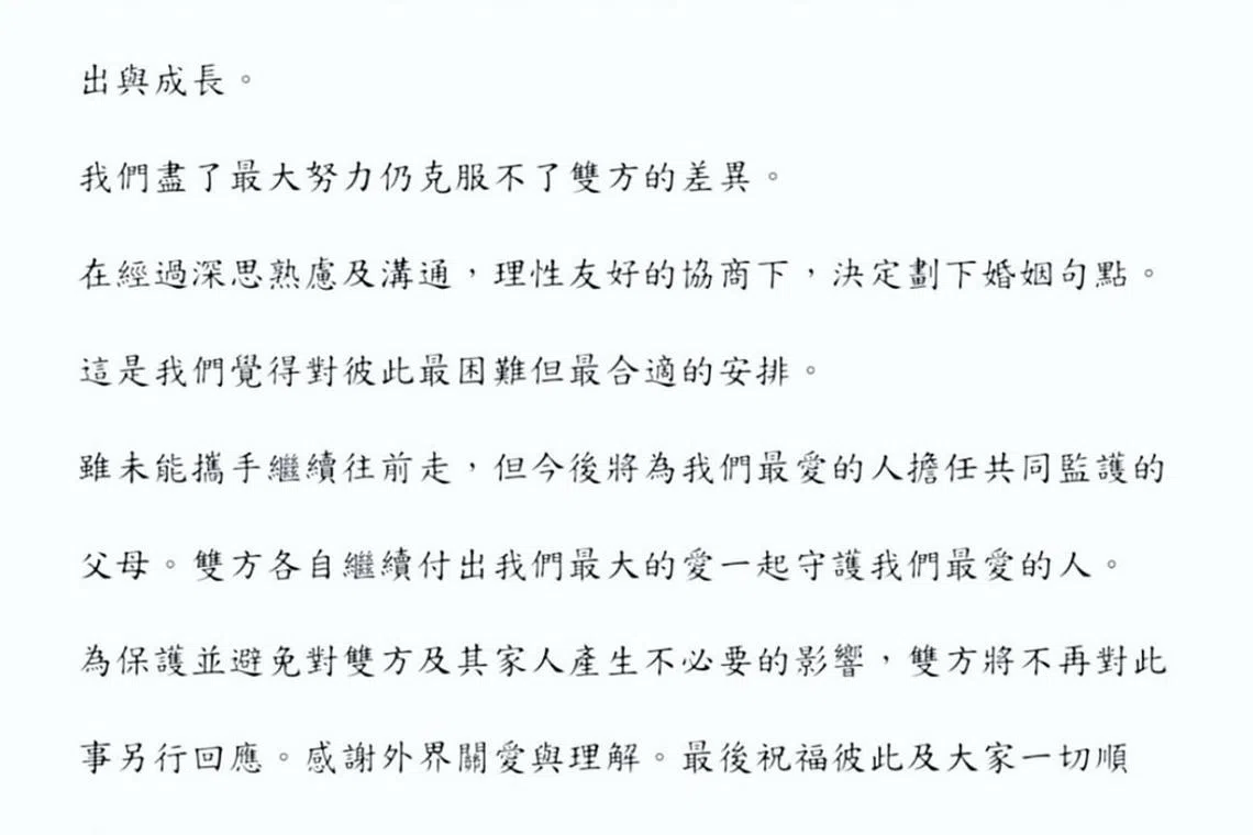 “We are grateful for each other’s dedication and growth throughout our marriage for the past nine years. We tried our best, but were ultimately unable to overcome our differences,” the statement said in Chinese.