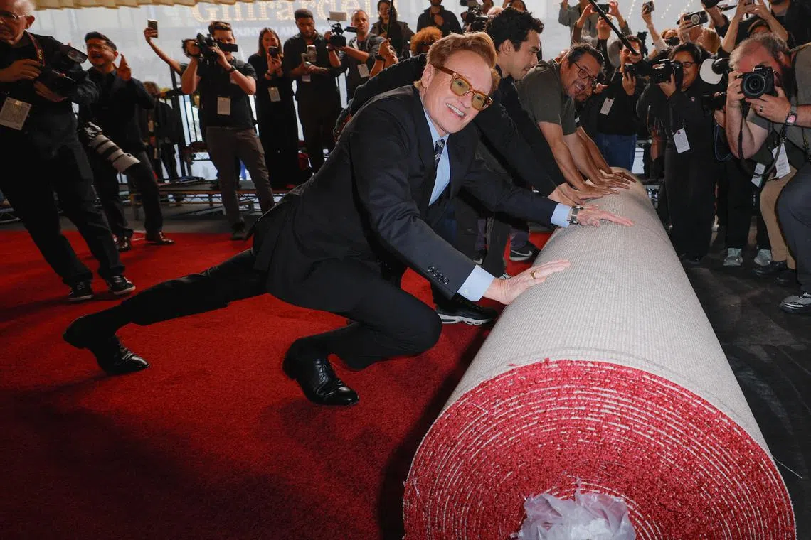 Conan O’Brien pushes the rolled red carpet at the 97th Academy Awards in Los Angeles on Feb 26.