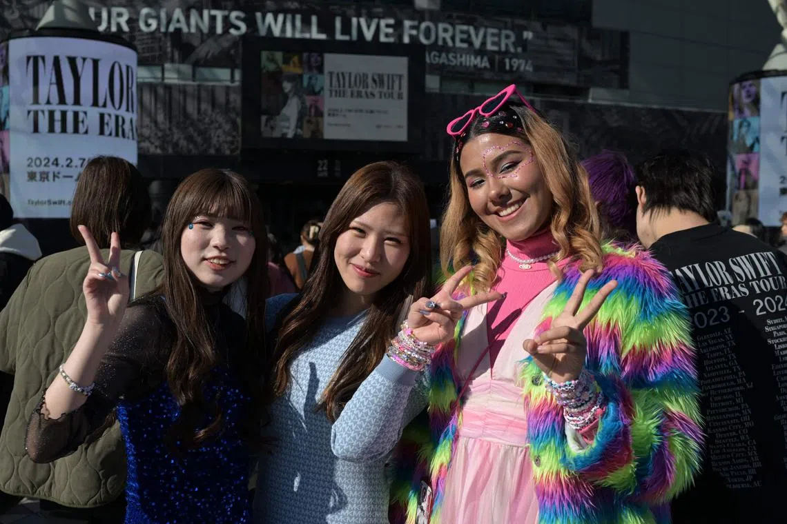 Taylor Swift fans posing for a photo in front of the Tokyo Dome a few hours ahead of the first leg of her Asia-Pacific Eras Tour.
