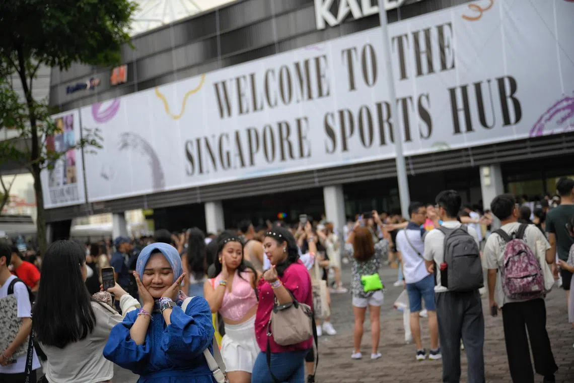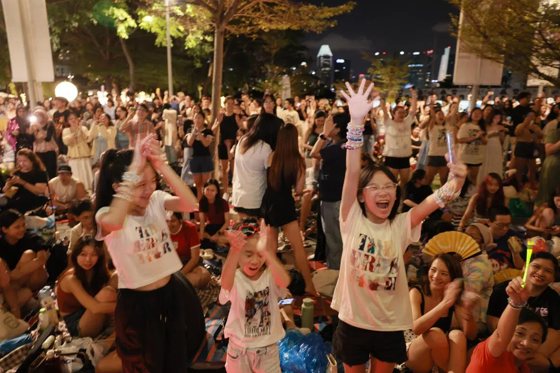 Singing along to Taylor Swift’s songs outside the National Stadium are (from left) sisters Averie Li, 12, and Aries Li, nine, and their friend Andrea Poh, 12.