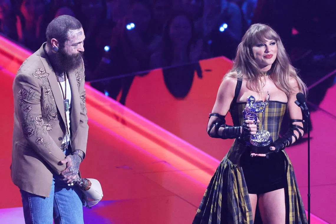 Taylor Swift and Post Malone accept the award for Best Collaboration for Fortnight during the 2024 MTV Video Music Awards in Elmont, New York, on Sept 11.