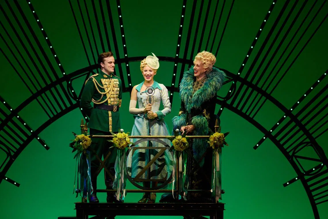 (From left) Fiyero (Australian actor Liam Head), Glinda (Australian actress Courtney Monsma) and Madame Morrible (Australian actress Jennifer Vuletic) in a scene from Act 2.