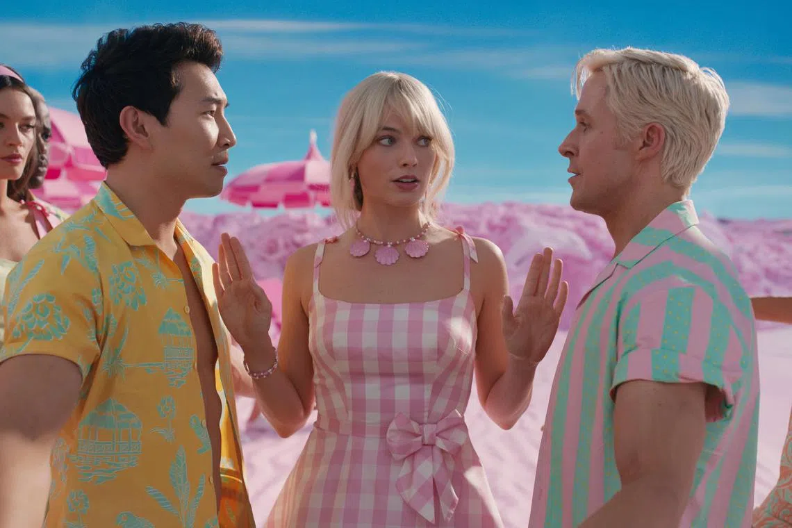 (From left) Simu Liu, Margot Robbie and Ryan Gosling in Barbie.