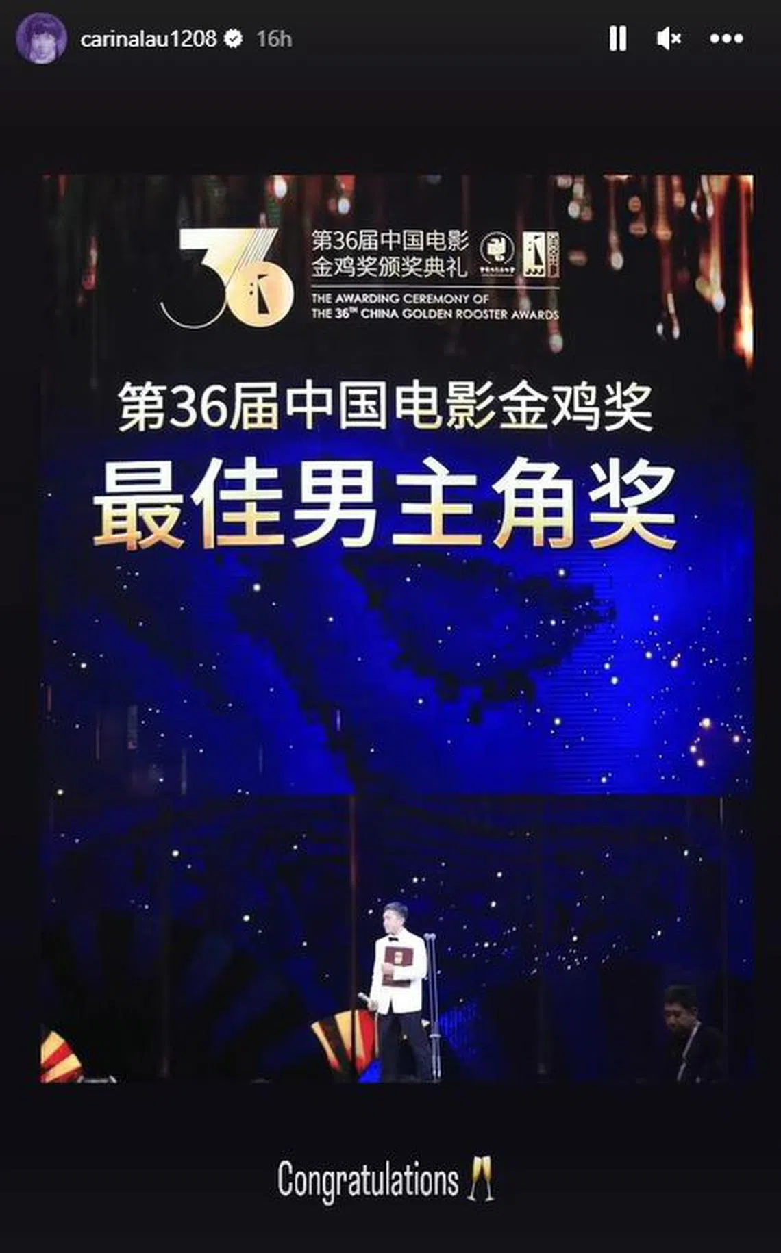 Leung’s wife Carina Lau – who was the 2007 Golden Rooster Best Actress winner for the thriller Curiosity Kills The Cat – posted photos on Instagram of Leung receiving his trophy with a simple “congratulations” caption.