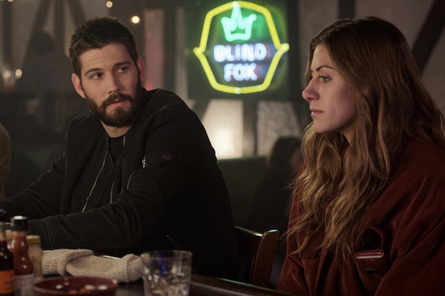 In The Dark stars Perry Mattfeld (right) as a blind woman investigating the death of her friend.
