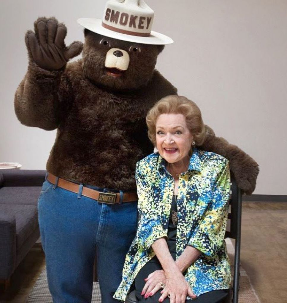 American actress Betty White posing with a mascot.