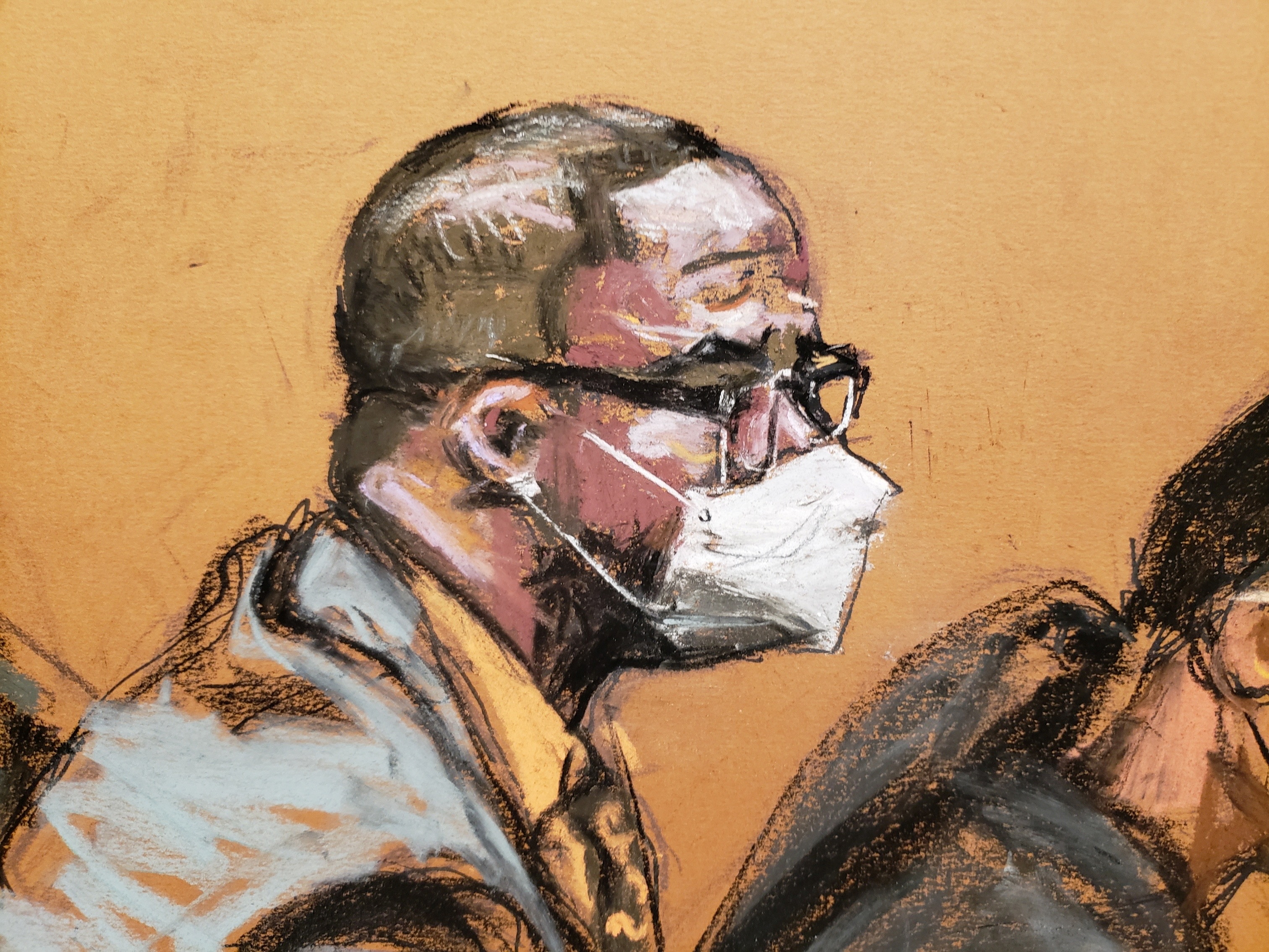 A courtroom sketch shows singer R. Kelly listening during his sex abuse trial in New York.