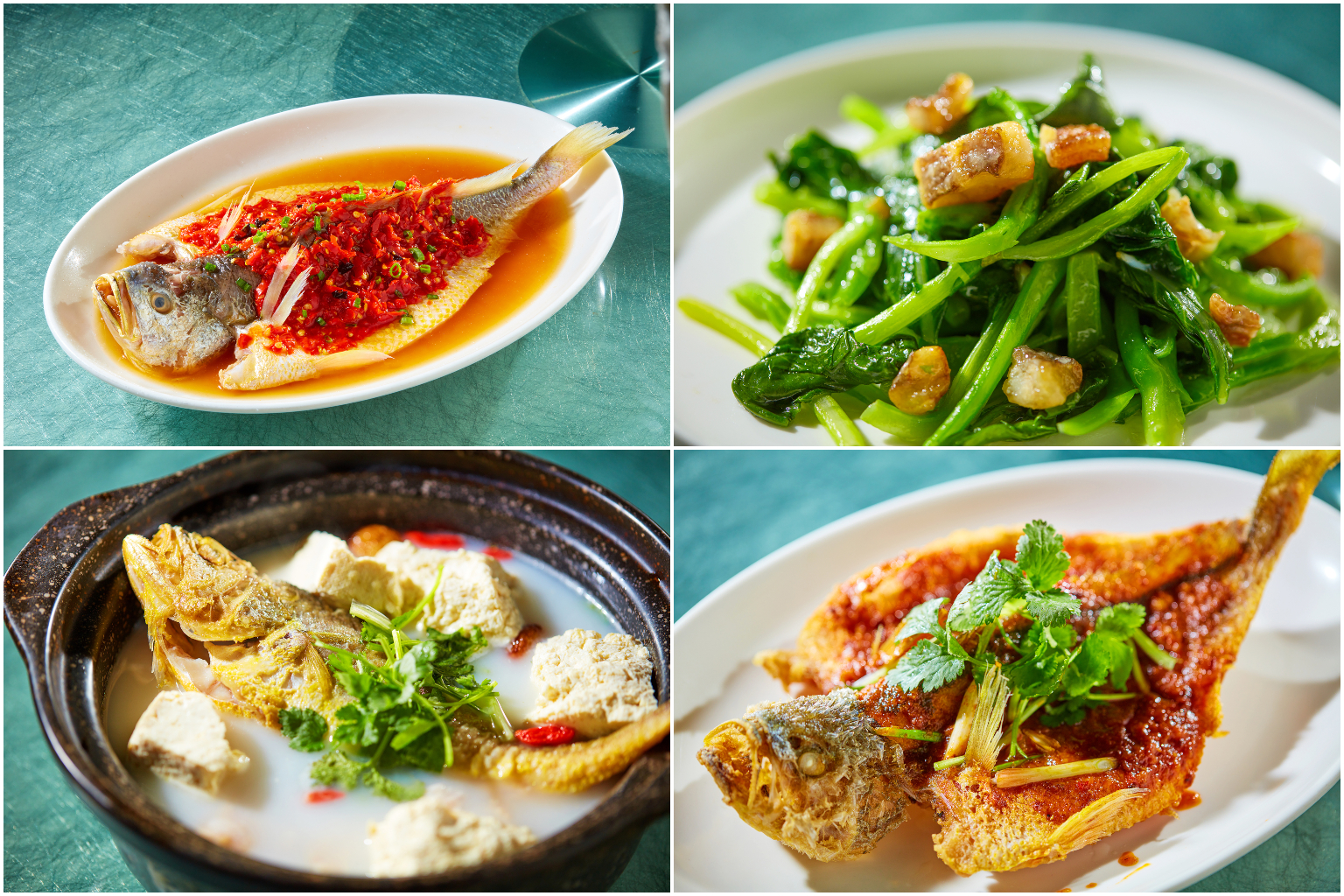 (Clockwise from top left) Yellow Croaker in Chopped Chillis, Chinese Kale Fried With Salted Yellow Croaker, Yellow Croaker in Sambal Sauce and Yellow Croaker Claypot Soup.