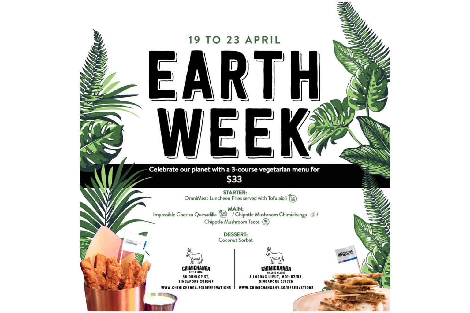 Chimichanga Little India and Chimichanga Holland Village are offering a week-long plant-based three-course set menu ($33 a person) that includes OmniMeat, Impossible Foods as well as Chimichanga's Chipotle Mushroom. They have also collaborated with environmentally-conscious brands to offer exclusive discounts.