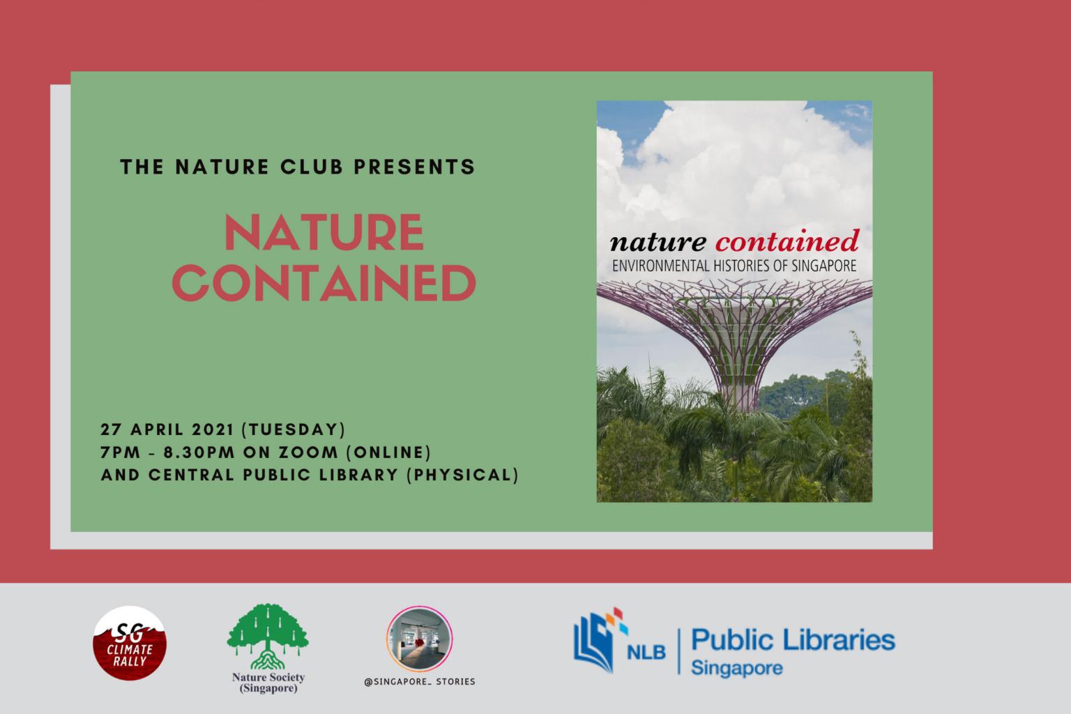 This book discussion covers Nature Contained: Environmental Histories Of Singapore (2014) by Timothy Banard. Participants can also join in a closing tour of a National Library Board's exhibition that explores Singapore's relations with the environment throughout history.