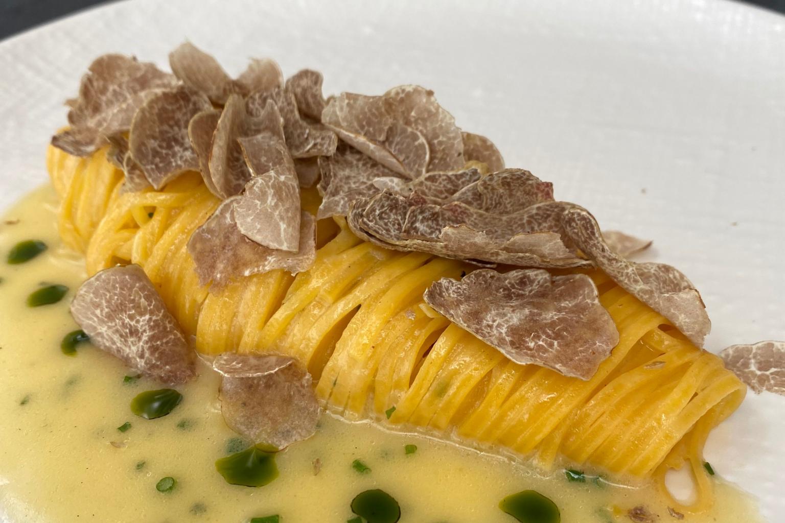 Highlights include house-made tagliolini, dressed in butter sauce and capped with petals of white truffle shavings.