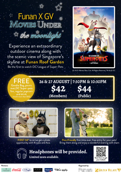 Catch this preview screening at Golden Village's (GV) exclusive outdoor silent cinema at Funan mall's roof garden. Headphones are provided. All patrons are invited to bring along their furkids and dress them up as SuperHero pets. A goodie bag worth more than $55 and a free popcorn and Coca-Cola drink are included with each purchase.