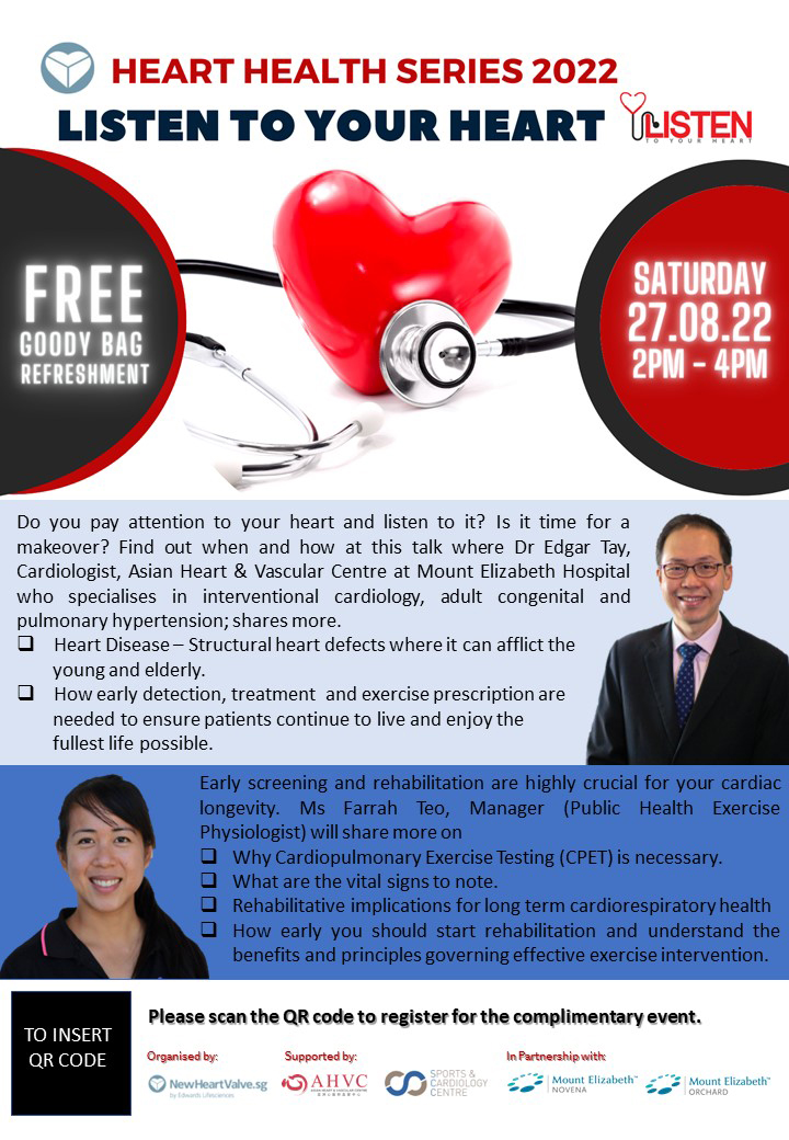 This is the second part of the Heart Health Series by Edwards Lifesciences, an organisation focused on medical innovations for structural heart disease. Participants will learn more about how structural heart defects can afflict the young and elderly through the different types of heart diseases, and how early detection and rehabilitation is crucial for cardiac longevity. Conducted by cardiologist Edgar Tay from Mount Elizabeth's Asian Heart And Vascular Centre.