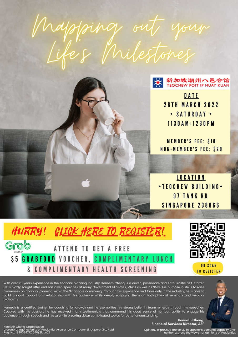 Mr Kenneth Cheng, financial services director from Prudential Assurance Company Singapore, will share tips on charting an effective financial plan to map out life milestones. Participants will receive a free $5 GrabFood voucher and a complimentary health screening. Organised by Teochew Poit Ip Huay Kuan.