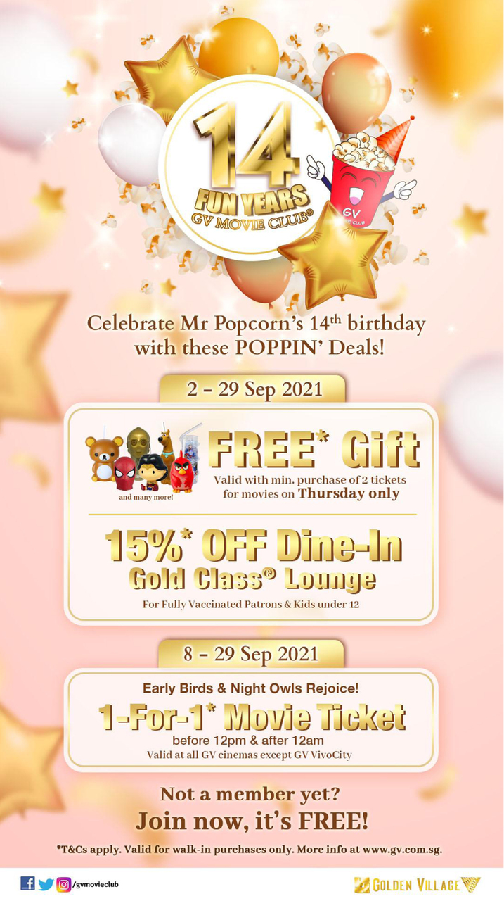 GV Movie Club is celebrating their 14th annivesary with exclusive member deals. Redeem a free gift with a minimum purchase of two tickets for screenings on Thursdays. Enjoy 15 per cent off your bill when you dine-in at the Gold Class lounge at GV Grand, GV Suntec and GV VivoCity. Enjoy one-for-one movie sessions for movies before noon and after 12am - at any cinema except GV Vivo. To become a GV member, sign up online for free.