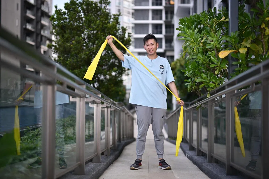 Insurance agent Christopher Lek, 40, exercises with a resistance band to rehabilitate his fractured left shoulder.