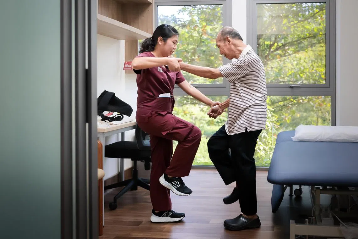 Mr Yeong Hung Peng, who has Parkinson’s disease, exercising with the help of Alexandra Hospital senior physiotherapist Pang Zhi Ling.