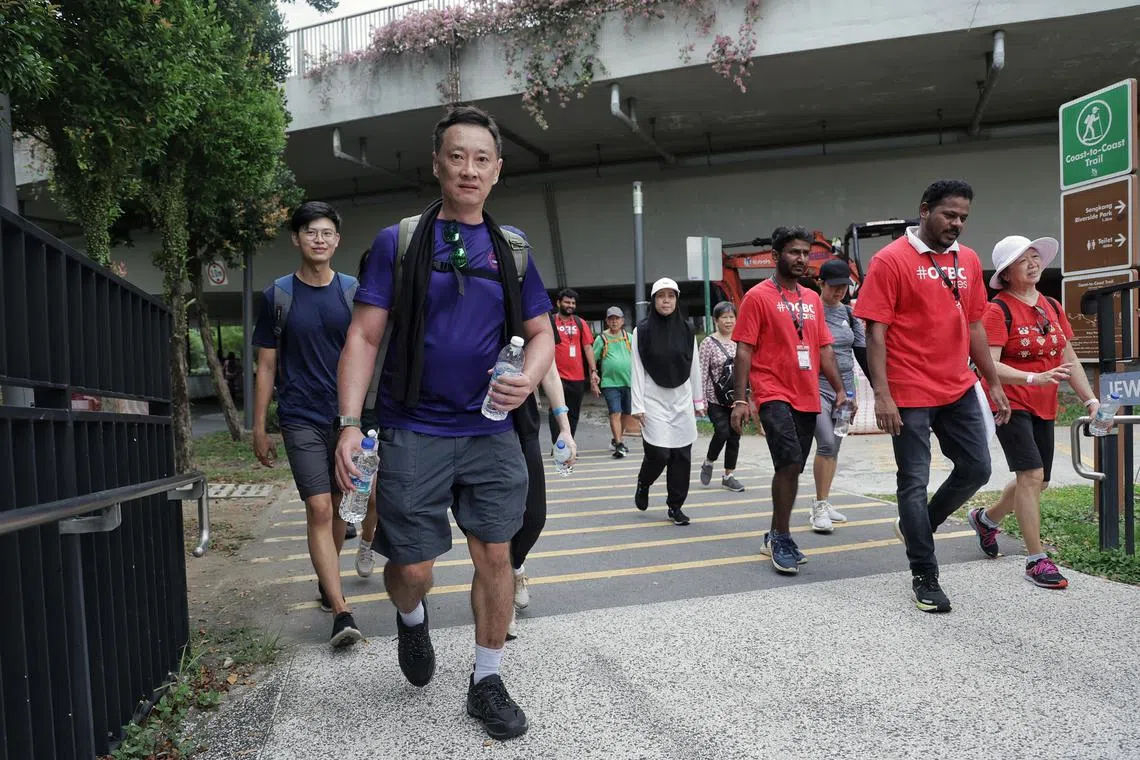 Programme manager and stroke survivor Adrian Quah walking with a weighted backpack (rucking) during a training session organised by social service agency Care Corner Singapore at Punggol Waterway Park.