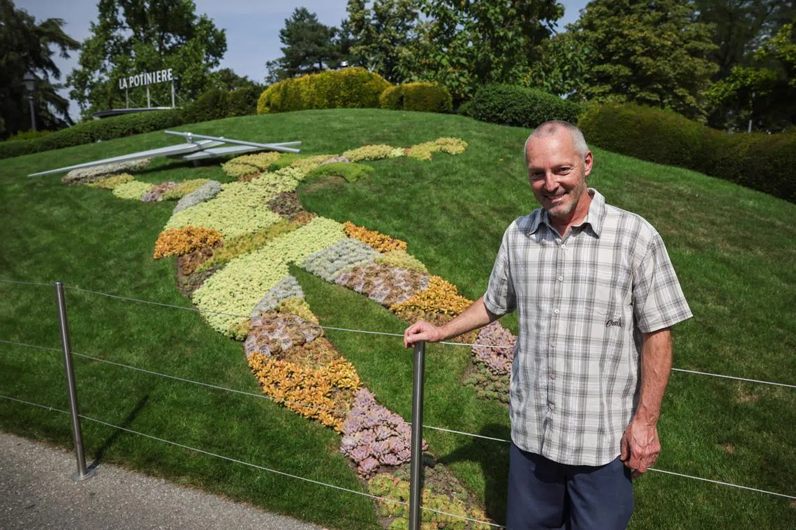 Landscape designer Pascal Bandelier, foreman of the Geneva Green Spaces Department, with Horloge Fleurie (Flower Clock).