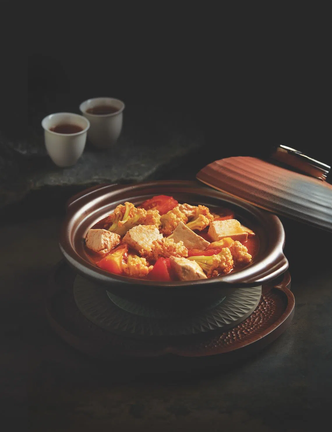 The turnip is also mixed into the salted pork fried rice ($32), along with other vegetables. Fragrant and flavourful, this is a dish well worth the carbs. It pairs nicely with tangier offerings like the casserole of stewed tofu, organic cauliflower and tomato ($34).