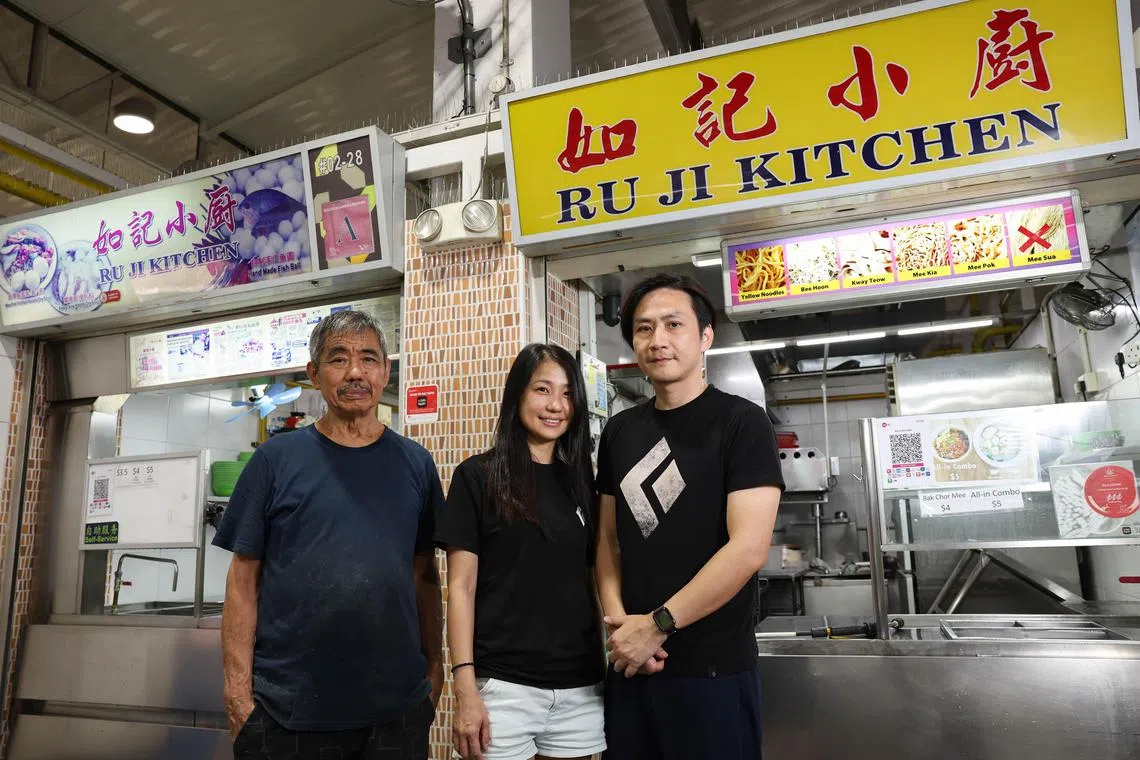 (From left) Ru Ji Kitchen's owner David Ng, with his daughter Joanne Ng and son-in-law Daniel Lee, at his 21-year-old stall at Holland Drive Market & Food Centre.