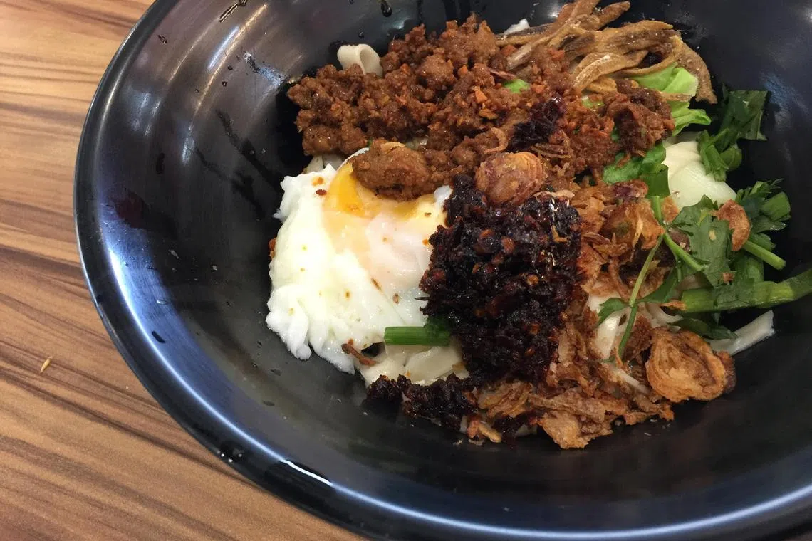 The signature chilli dry ban mian from Hui Wei Chilli Ban Mian includes minced pork, meatballs, ikan bilis, wongbok cabbage, an egg and a dollop of chilli.