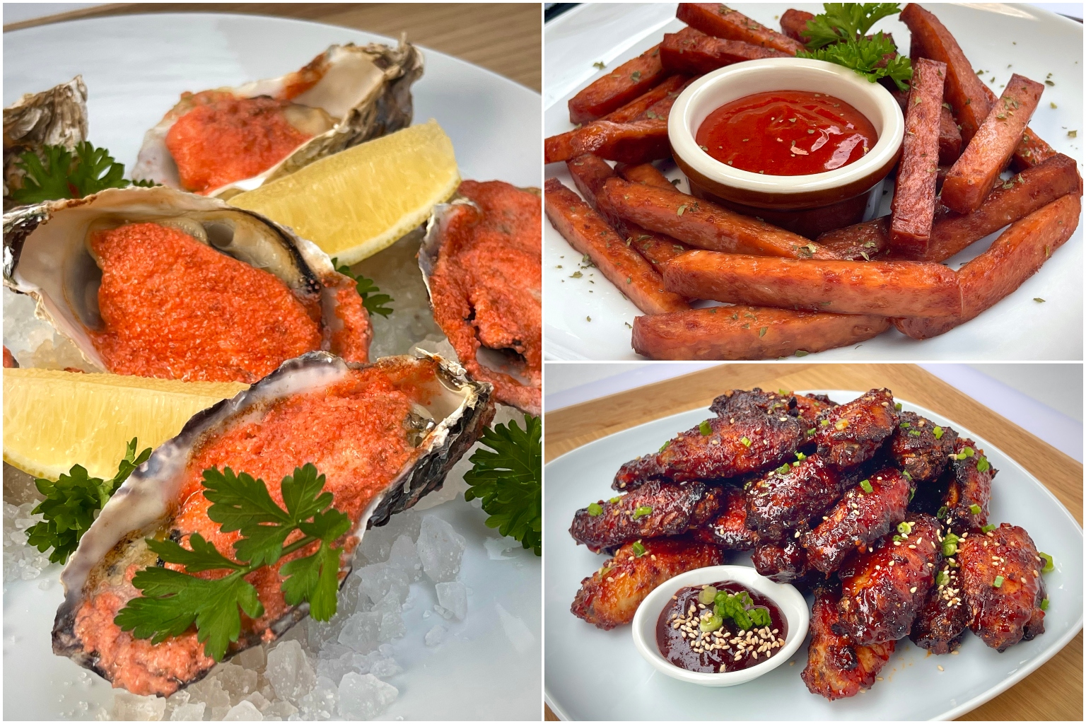 (Clockwise from left) Kaki Mentaiyaki, Korean luncheon meat fries, and Korean-style chicken wings with yangnyeom sauce.
