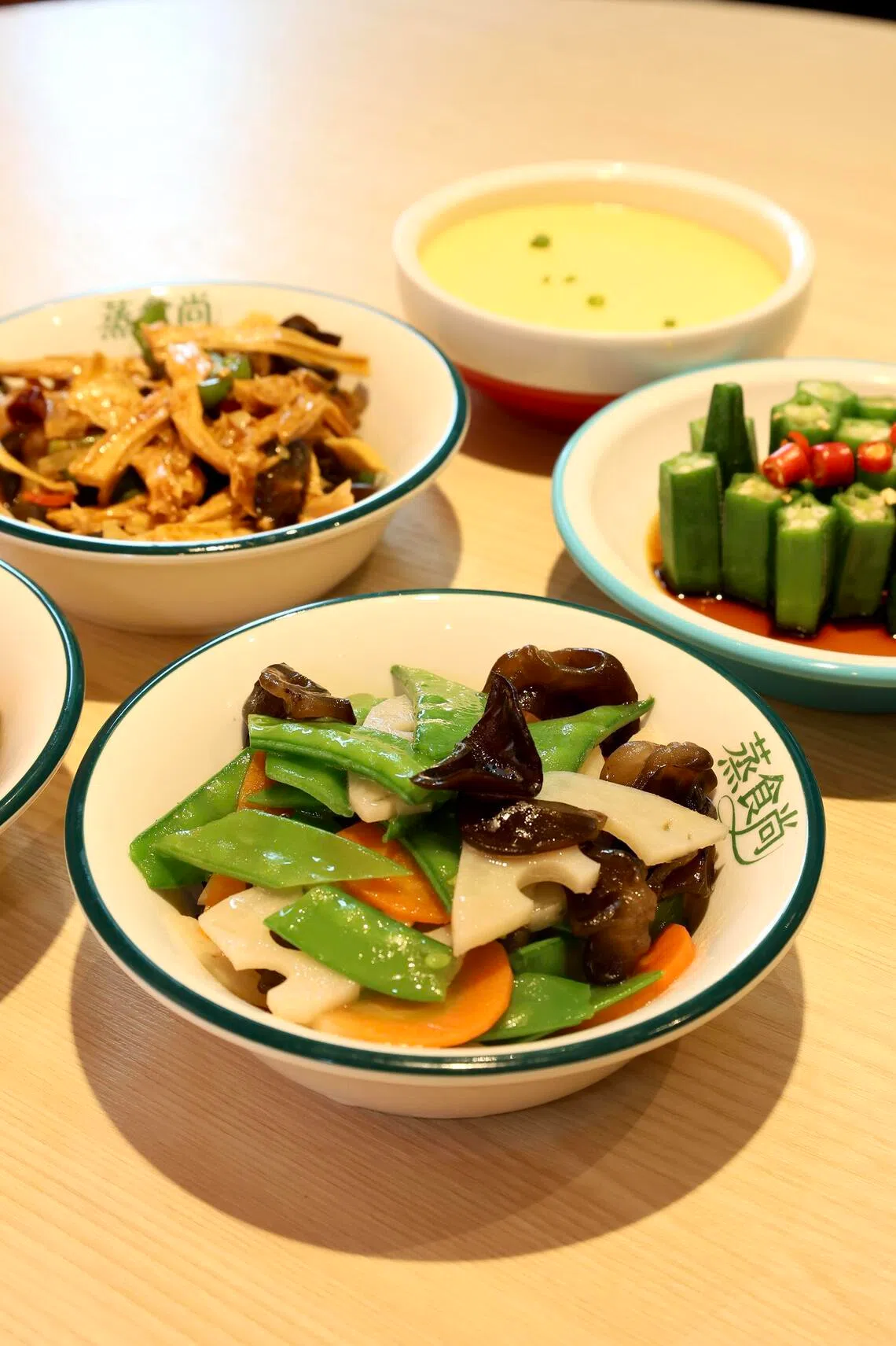 (Clockwise from top left) Stir-fried Pork Belly with Beancurd Stick and Black Fungus, Steamed Egg, Cold Okra Salad and Stir-fried Lotus Pond at Zheng Shi Shang Hunan Cuisine.