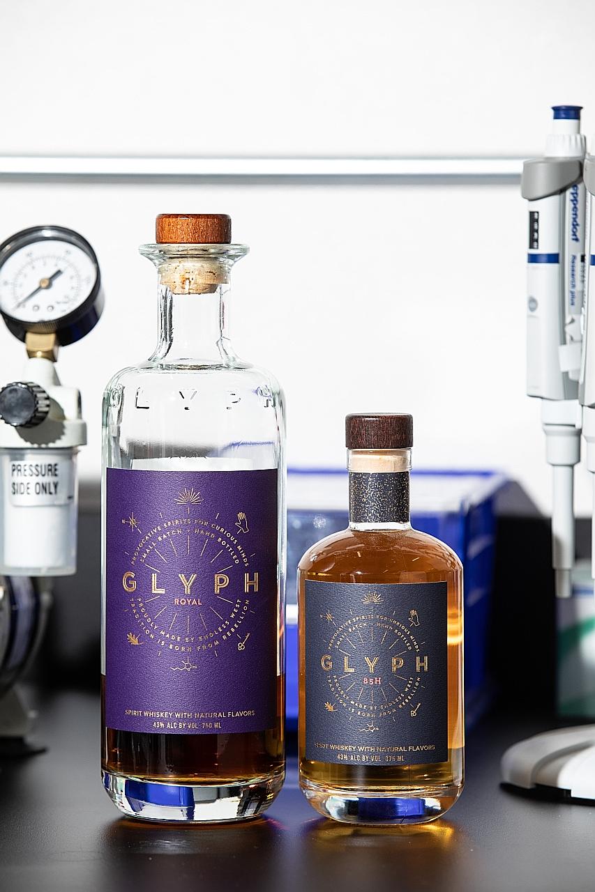 Whiskies (above) produced by Bespoken Spirits at its laboratory in Menlo Park, California; and Glyph (right), the flagship whisky of Endless West distillery in San Francisco.