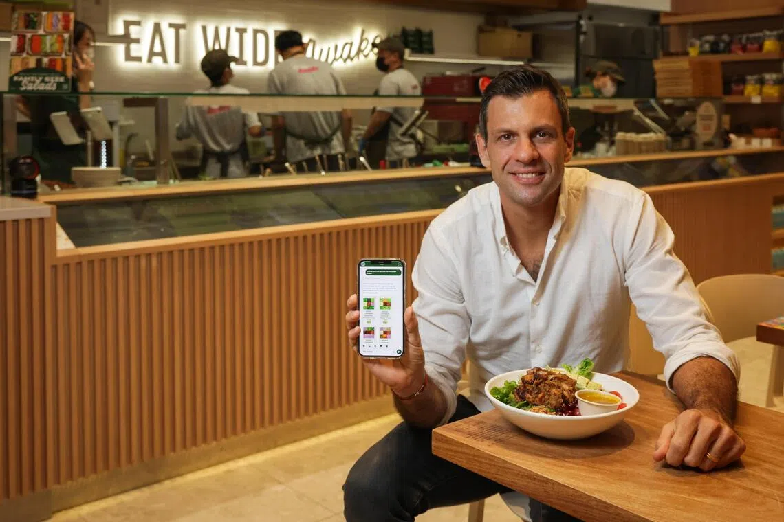 Mr Adrien Desbaillets, chief executive and co-founder of SaladStop! Group, showing its GenAI assistant Lulu on his mobile phone and its Lemongrass Chicken Bowl.