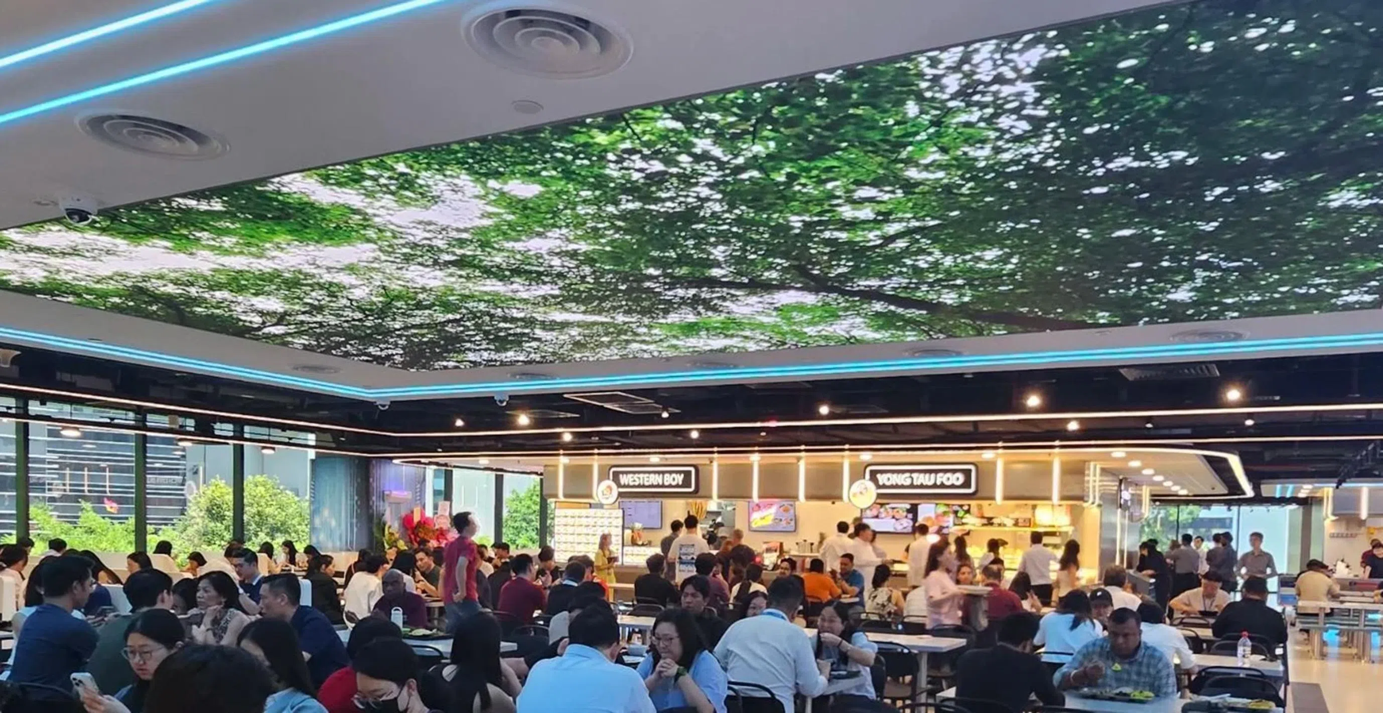 Kopitiam @ Mapletree Business City has a large overhead screen that displays nature scenes for a dynamic ambience.