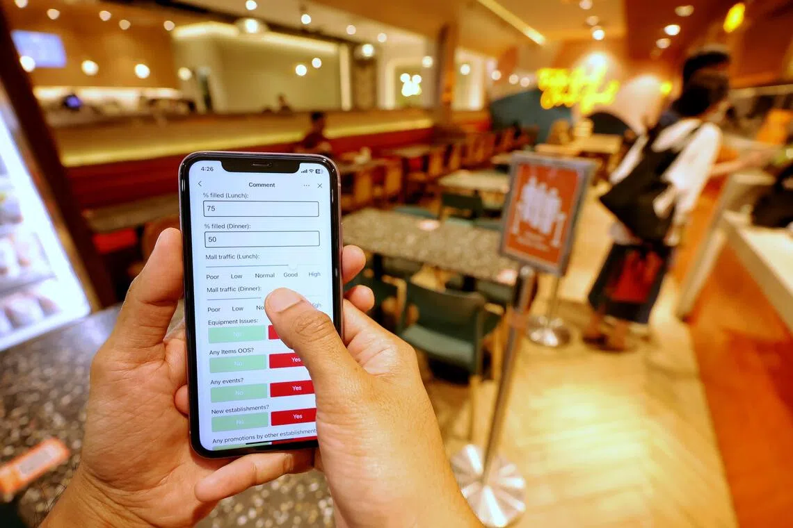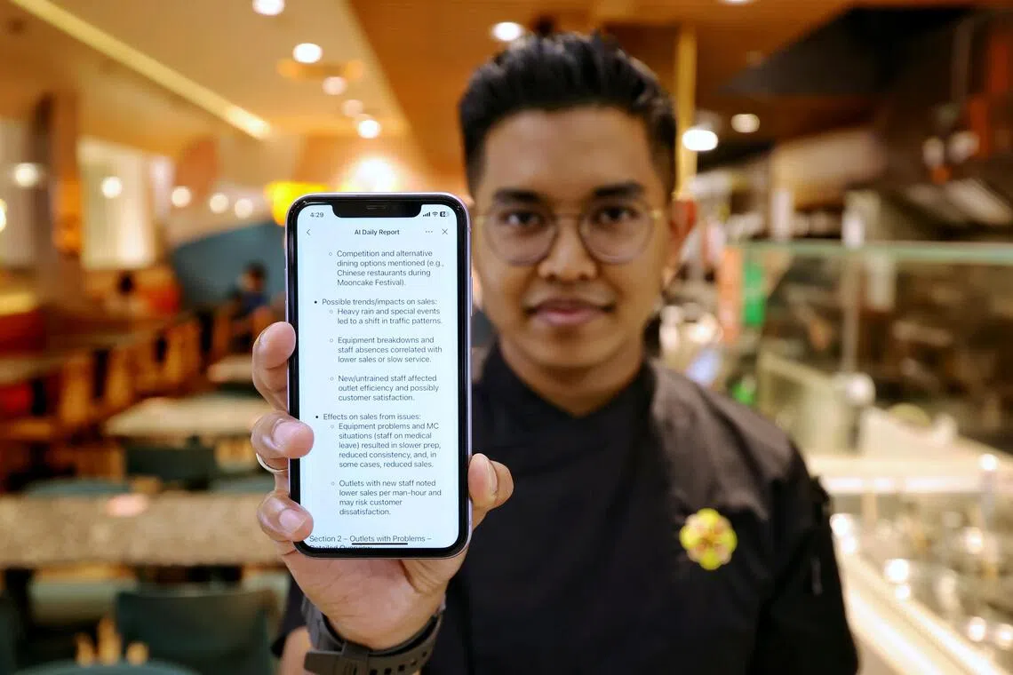 Mr Muhammad Jamsyir Aniq, manager of The Soup Spoon Union at Kallang Wave Mall, with a report generated by the AI engine from the data he keyed in via the mobile phone.