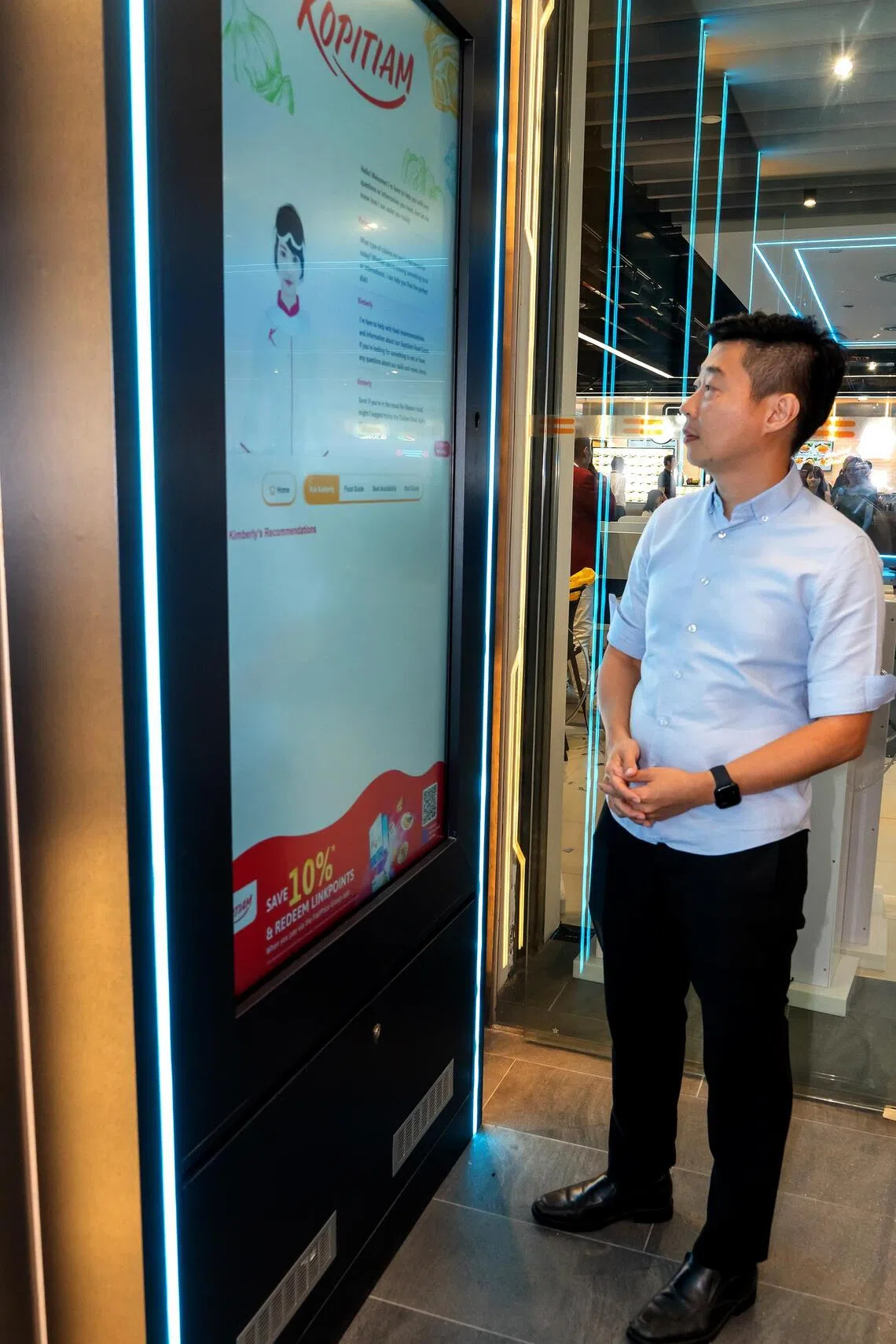 Right at the entrance of Kopitiam’s outlet at Mapletree Business City, diners are greeted by Kimberly, a friendly AI avatar on a display screen, that helps them navigate stalls and find seats, and even recommends what to eat.