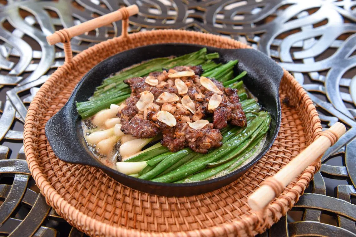 Pork and beef go through a three-step cooking process. In the kitchen, it is first seared on Korean hotstone pans, then flamed with large wall-mounted blowtorches at more than 1,000 deg C. The platters are then brought to the table, where the meat is flambeed with the restaurant’s “Special Essence”, an alcohol-laced concoction.