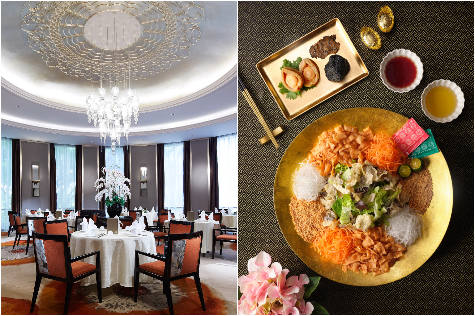Venues like Wah Lok Cantonese Restaurant in Carlton Hotel Singapore have been booked up since Dec 20, 2020. (Right) Truffle Abalone Lo Hei from Wah Lok.
