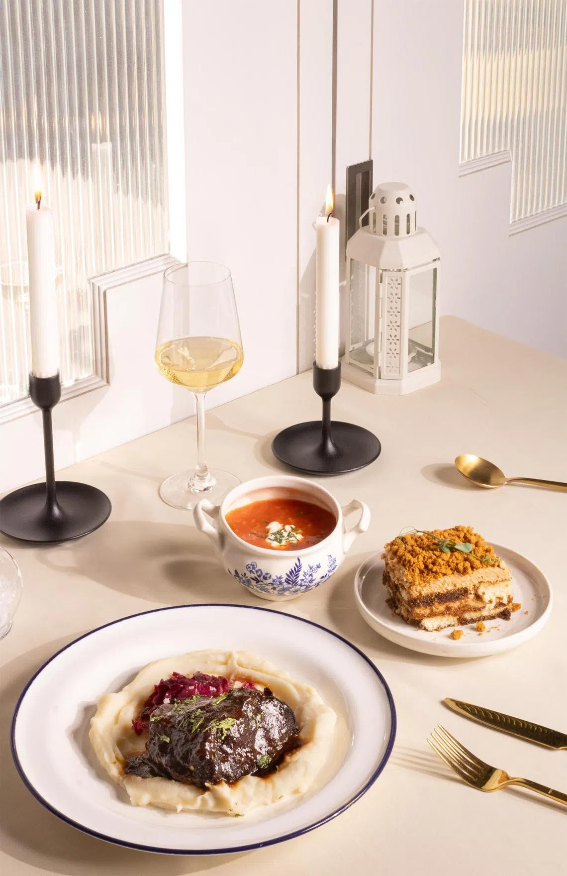 Starter options include borscht soup with sour cream or pepper-crusted duck and orange salad, followed by mains such as roasted turkey roulade with cranberry jam, Yorkshire pudding and roasted potato or Irish Guinness-braised beef cheek with potato mousseline and braised red cabbage. Vegetarian options are available too.