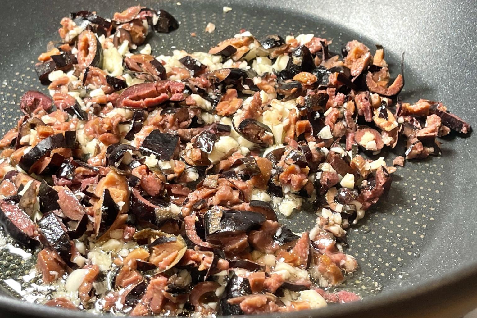 To release the aroma and flavour of the olives, stir-fry them briefly with chopped garlic.