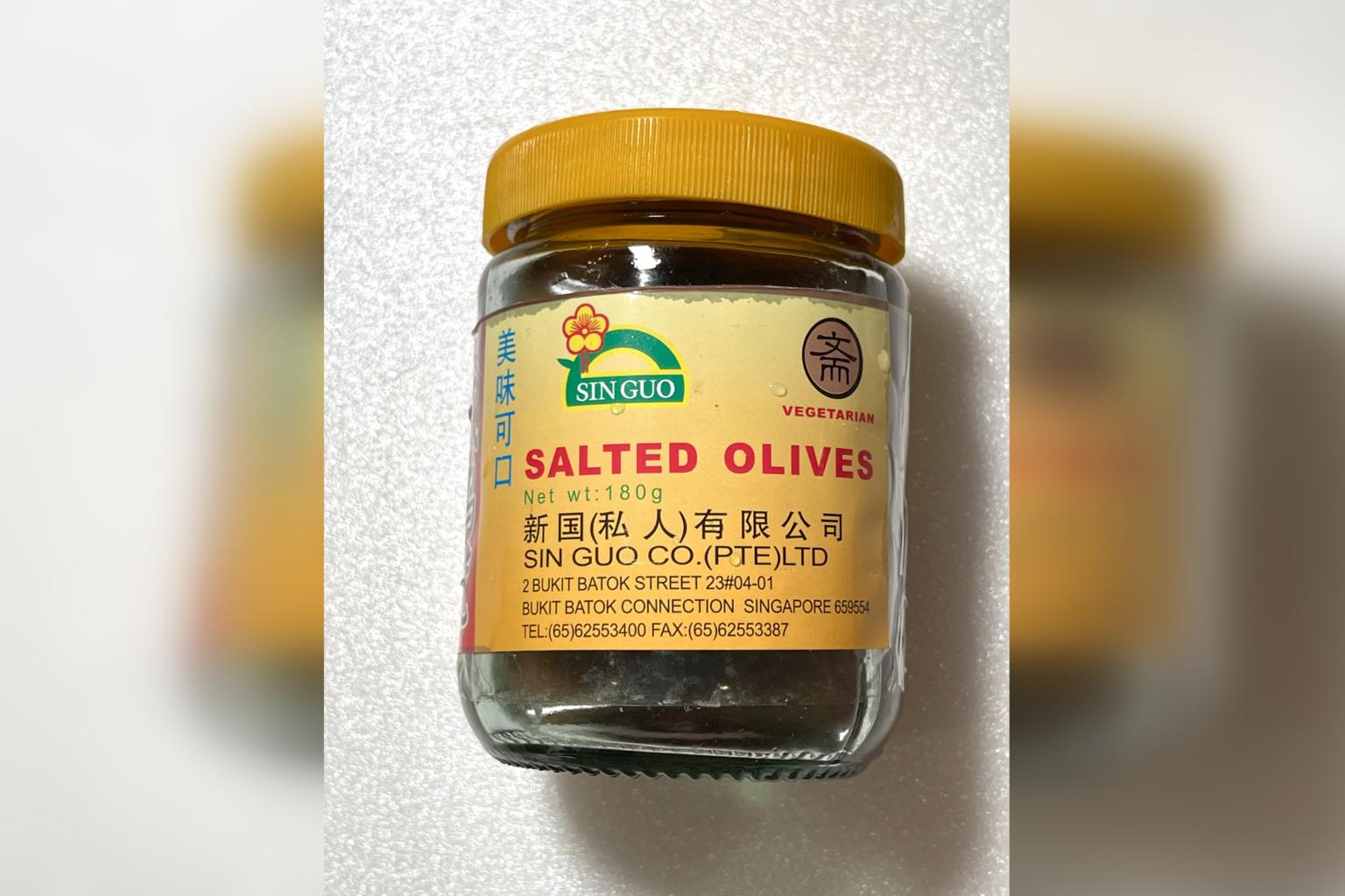 Preserved salted black olives are available at provision shops here, but there are not many choices. The brand commonly sold is Sin Guo. Or search for salted black olives online. One 180g jar contains about 12 olives. I use all of them for two yellow croakers. By the time you pit them, there is not much olive flesh left.