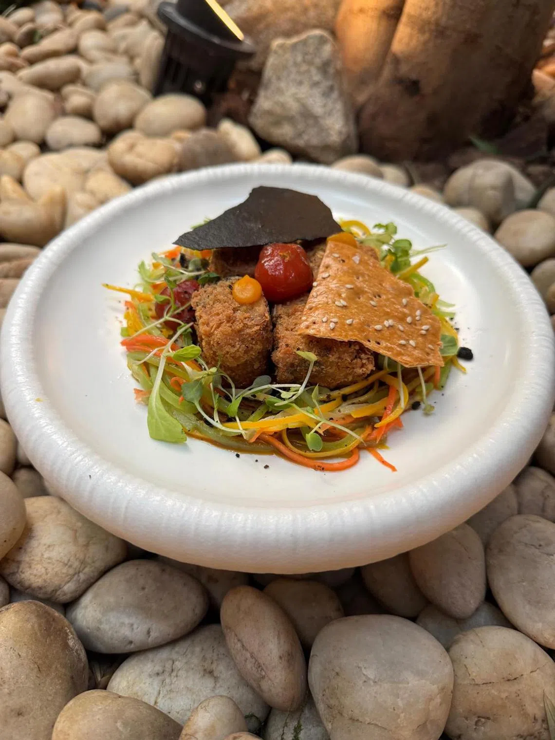 His version is served on a bed of julienned carrots, yellow zucchini and celtuce tossed in a lemon vinaigrette. It is topped with butternut squash puree, cherry tomatoes and microcress, and finished with a charcoal tuille and spiced lavosh.
