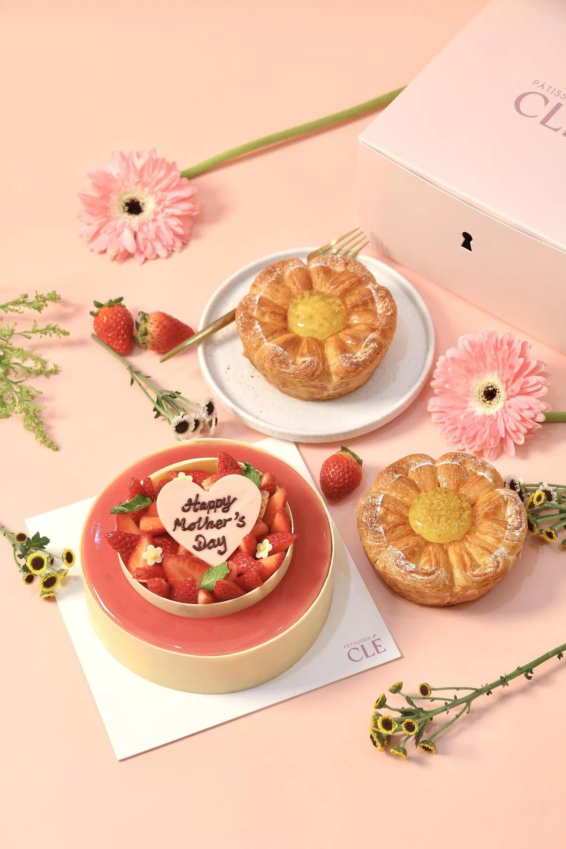 Patisserie Cle's Mother's Day cake (left) and yuzu osmanthus flower pastries.