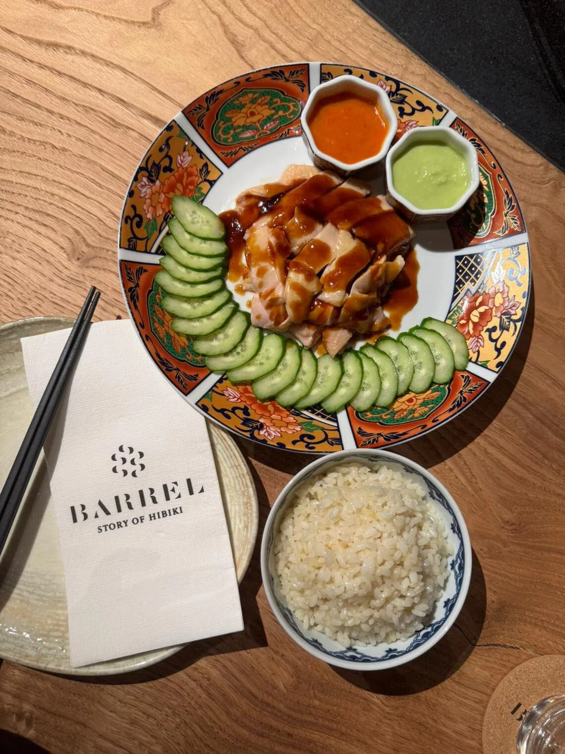 Barrel's spin on chicken rice, where the delicately poached chicken is finished with a Hibiki-infused sauce.